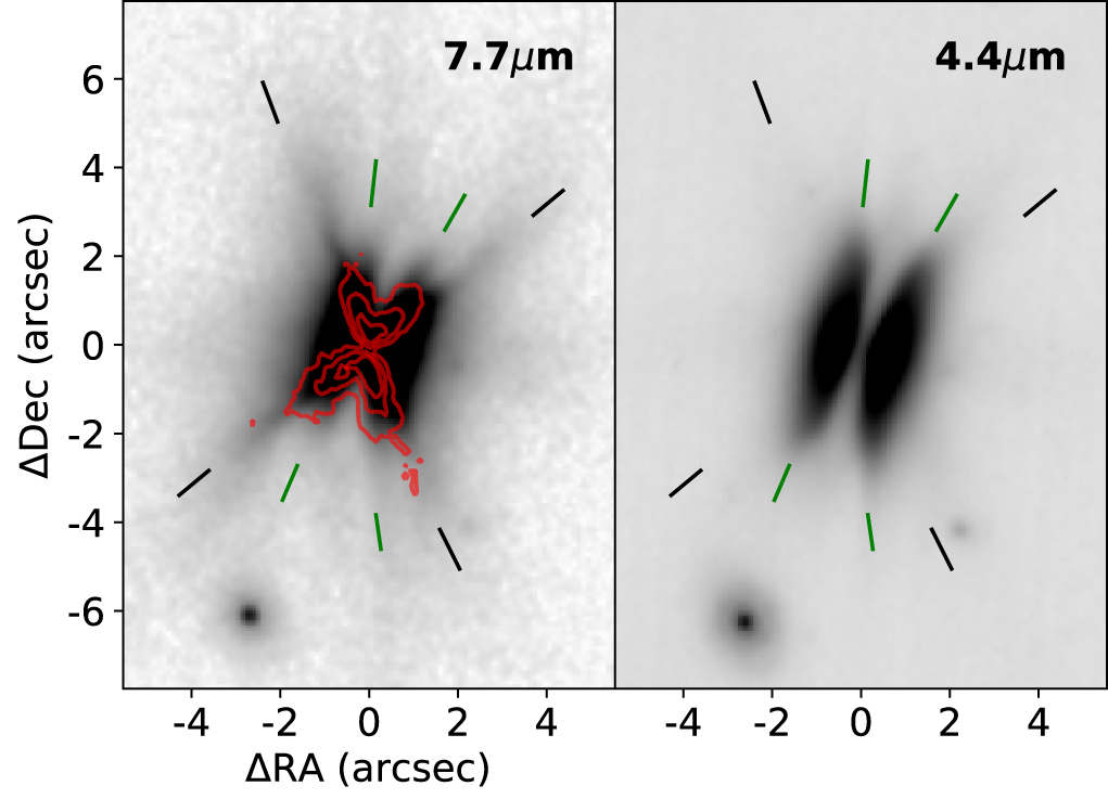 Moreover, the JWST images have unveiled an intriguing X-shaped feature above the disk’s warm molecular layer, traced by CO line emission, which might be linked to a disk wind carrying small dust grains. This phenomenon aligns with the highest elevations detectable in visible wavelength scattered light and presents an unusual kinematic signature in CO emissions, offering new avenues for understanding disk dynamics and evolution.