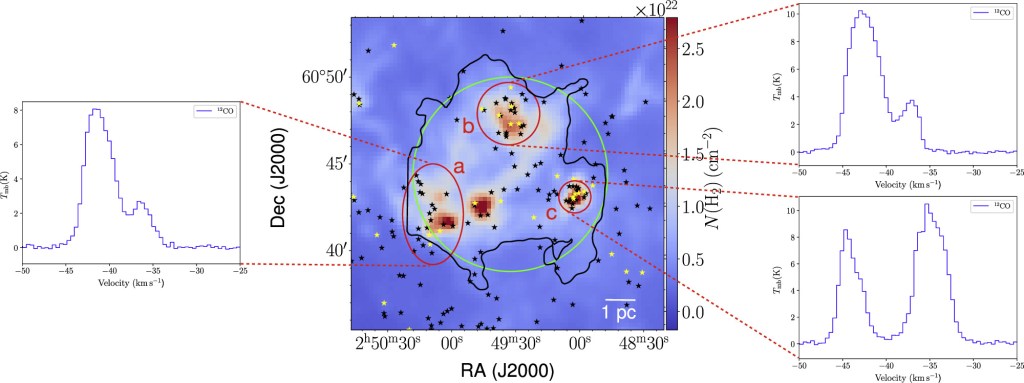 Source: Issac, Namitha, et al. “Cloud–Cloud Collision and Cluster Formation in the W5NW Complex.” The Astronomical Journal, vol. 167, no. 4, 2024, p. 158, dx.doi.org/10.3847/15383881/ad2847, https://doi.org/10.3847/15383881/ad2847.